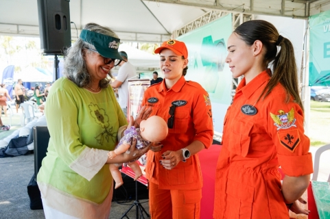 A soldado Spinelli, responsável por orientar o público sobre técnicas de desengasgo, destacou a relevância da disseminação de informações para a prevenção de acidentes.